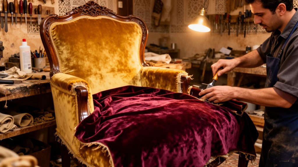 Notre atelier est le cœur battant de Mervel Decore. C’est ici que la magie opère, que les tissus prennent vie, que les meubles se transforment.